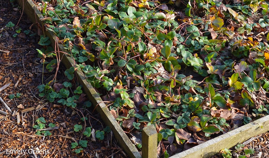 tidy strawberry plants, cut back old, dead and diseased